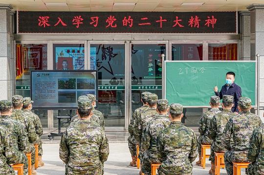 圖為東壩頭鄉(xiāng)張莊村第一書(shū)記余強(qiáng),到營(yíng)區(qū)宣講黨的二十大精神。
