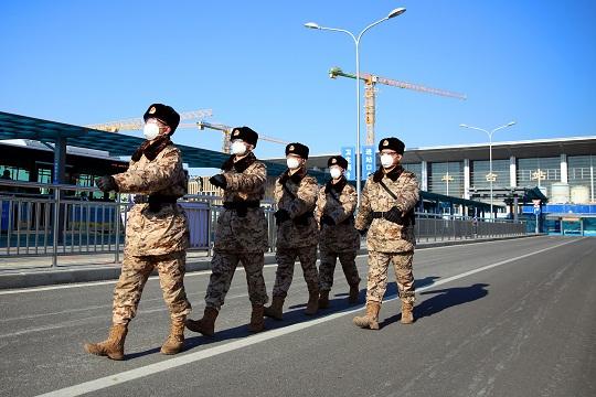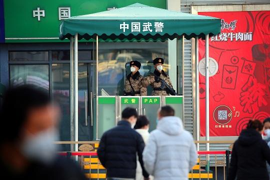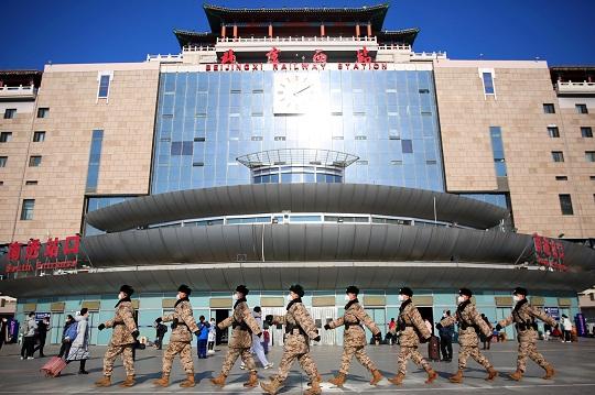 圖為北京豐臺站執(zhí)勤武警奔赴執(zhí)勤哨位。