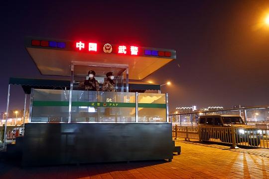 圖為華燈初上,武警官兵堅守在執(zhí)勤哨位。