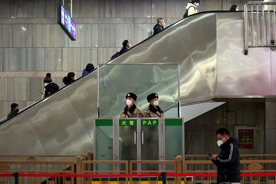 圖為北京西站北廣場旅客人頭攢動,武警官兵認真執(zhí)勤。