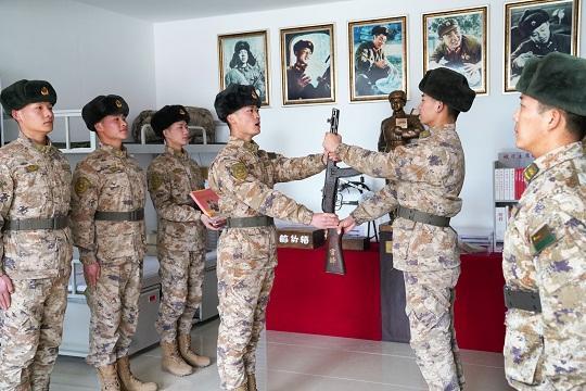 圖為第79集團軍某旅“雷鋒班”班長牟振華(左四)將“雷鋒槍”交接給新入班戰(zhàn)士蔣佳恒(右二)。 張永進 攝