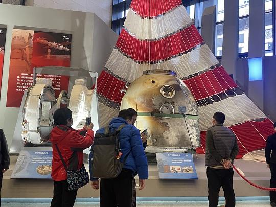 國(guó)博展廳里,神舟十三號(hào)返回艙前圍滿了參觀者,他們?cè)诎唏g發(fā)黃的返回艙前駐足、拍照。