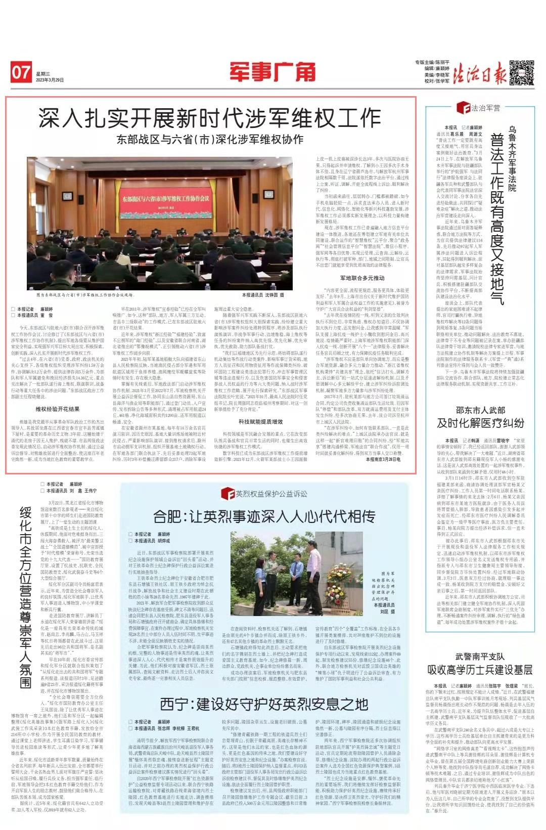 今天,東部戰(zhàn)區(qū)與駐地六?。ㄊ校┞?lián)合召開涉軍維權(quán)工作協(xié)作會議,討論修訂了《東部戰(zhàn)區(qū)與六?。ㄊ校┥孳娋S權(quán)工作協(xié)作機制》,提出軍地各級要從維護國家安全利益、實現(xiàn)強軍興軍目標大局出發(fā),積極探索、創(chuàng)新實踐,深入扎實開展新時代涉軍維權(quán)工作。