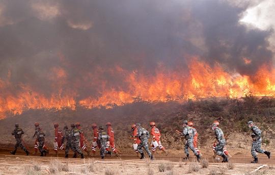 圖為武警麗江支隊官兵和麗江軍分區(qū)民兵奔赴火場參與滅火。欒鋮 攝