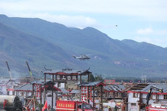 圖為直升機突入“災區(qū)”。