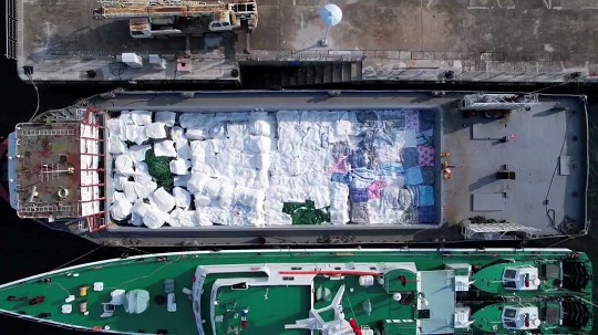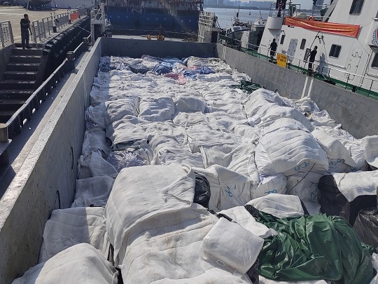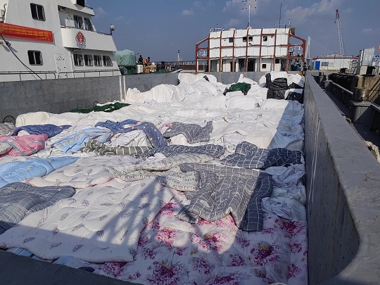 經(jīng)查,該嫌疑船為鐵質(zhì)運(yùn)輸船,駕駛臺(tái)后方為貨艙,貨艙內(nèi)裝有白色和黑色塑料編織袋,袋內(nèi)有來(lái)源不明的牛肉、牛腩、牛肚、牛筋、驢雜等凍品約485噸,案值約4000萬(wàn)元,隨船人員均未能提供船上所裝載貨物的相關(guān)合法來(lái)源證明,執(zhí)法員依法對(duì)該船舶和凍品進(jìn)行扣押。