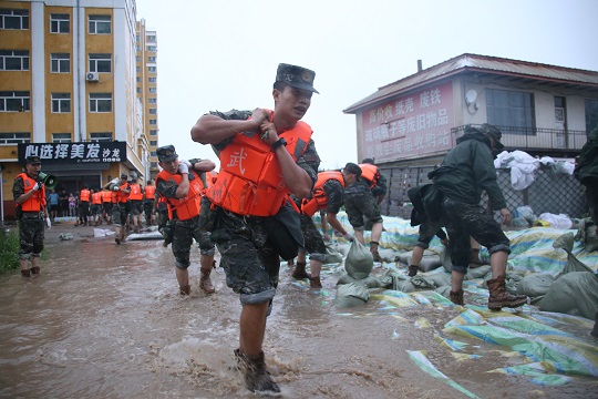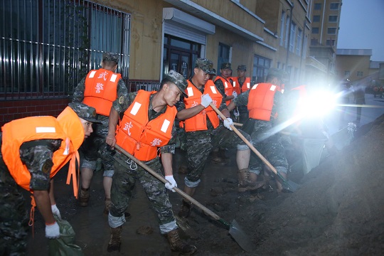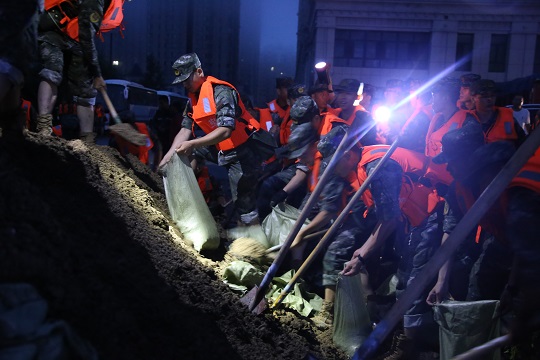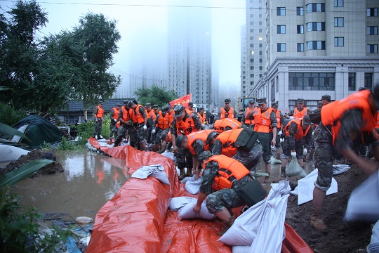 8月4日0時20分,武警黑龍江總隊哈爾濱支隊200余名官兵緊急馳援,連夜奮戰(zhàn)9小時,在螞蟻河周邊壘筑沙袋2.8萬余個,筑起1.3米高阻隔沙墻600余延長米,保證了當?shù)厝嗣袢罕娚敭a安全。