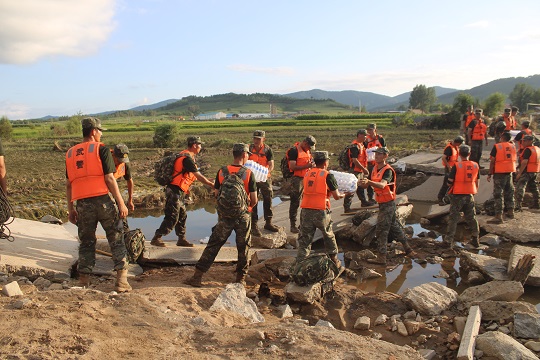 圖為武警吉林總隊吉林支隊官兵用人橋代替石橋接力搬運救災(zāi)物資。