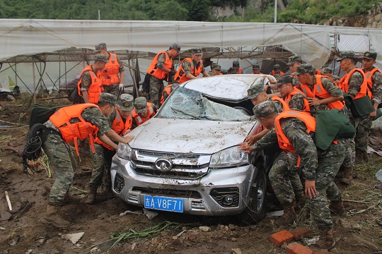 圖為武警吉林總隊吉林支隊官兵合力推行車輛,轉(zhuǎn)移被困群眾。