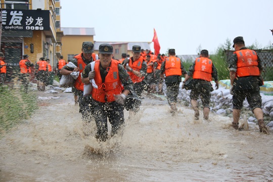 8月5日清晨,北部戰(zhàn)區(qū)陸軍第78集團軍某特戰(zhàn)旅出動800余名官兵,赴黑龍江省牡丹江市區(qū)加固堤壩。官兵奮戰(zhàn)17個小時,裝填10萬余個沙袋,加固堤壩2500多米。他們滿臉汗水、一身泥水,手提肩扛、奮力拼搏的樣子,感動了在場所有群眾。不知誰喊了句“解放軍壘的不僅是沙袋,還是鋼鐵長城”,群眾熱烈鼓掌。