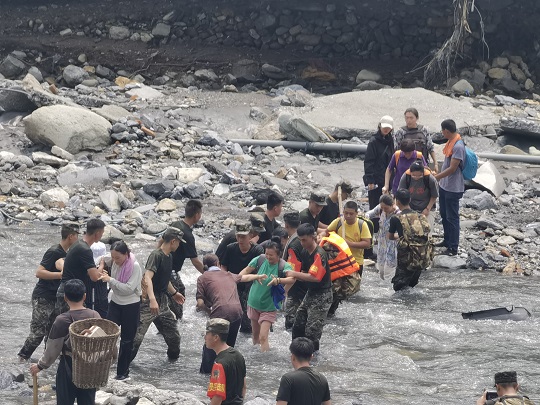 在受災地區(qū),橋梁盡數(shù)沖毀、道路塌方嚴重,一路上不時有落石從山上滾下。連續(xù)多天的任務,讓官兵疲憊不堪,高溫、暴雨,都在考驗著任務官兵。