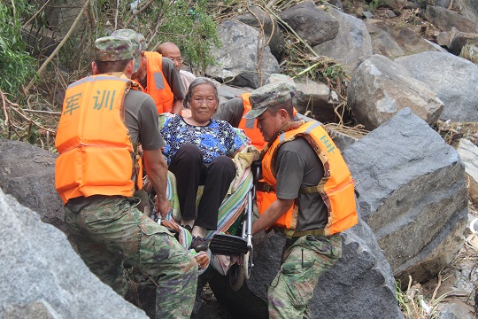 圖為7月31日,第81集團軍某工化旅官兵轉移被困群眾。本報通訊員 狄伯文 攝