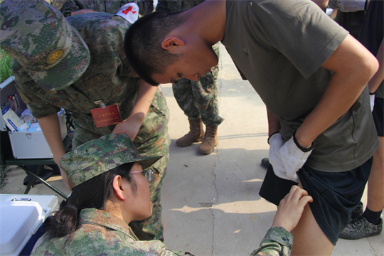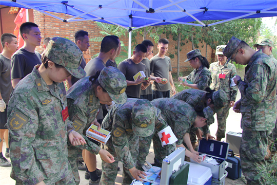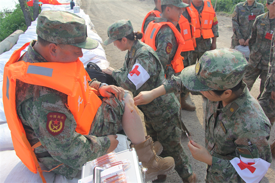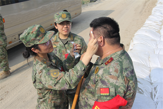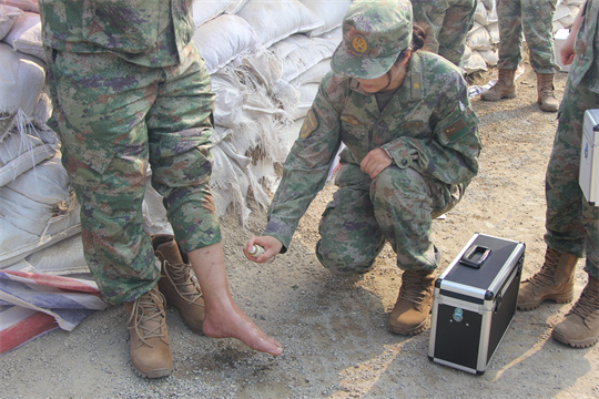 醫(yī)療隊抵達(dá)任務(wù)區(qū)域后,隊員們展開醫(yī)療救治工作。前線的戰(zhàn)士們由于蚊蟲叮咬和洪水長期浸泡,部分官兵出現(xiàn)感冒中暑、腹瀉濕疹、扭傷擦傷、皮膚潰爛等傷病情況。醫(yī)療隊迅即展開診療,對患病官兵開方拿藥,對尚未患病官兵講授預(yù)防,僅第一日便巡診180人次,處理傷口6人,開展健康防護(hù)科普宣教3場次。