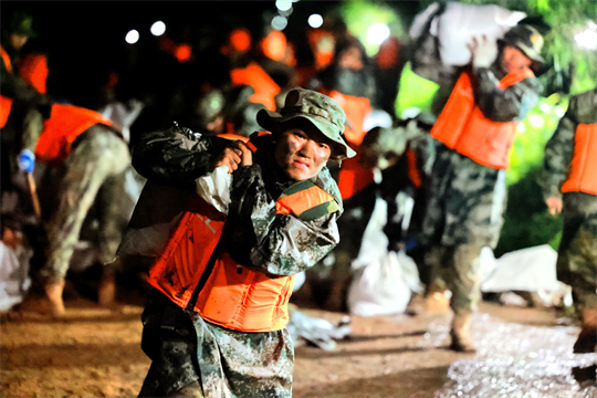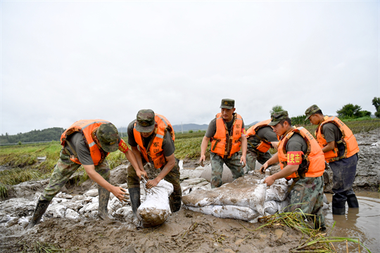 在某合成旅,眼看著水位越漲越高、水流越來越急、塌方越來越大,從旅長到列兵,大家冒雨喊著“人在堤在”口號(hào),一刻不停地鏟沙土、裝沙袋、堆沙墻。列兵鐘習(xí)文患有精索靜脈曲張,因長時(shí)間泡在水里導(dǎo)致墜脹和疼痛讓他直冒冷汗。身上痛手上活卻沒停,他一次又一次背著沙袋,一路小跑沖向河堤。