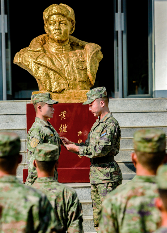 圖為“模范空降兵連”官兵在黃繼光銅像前組織授予榮譽編號儀式。王寶強 攝