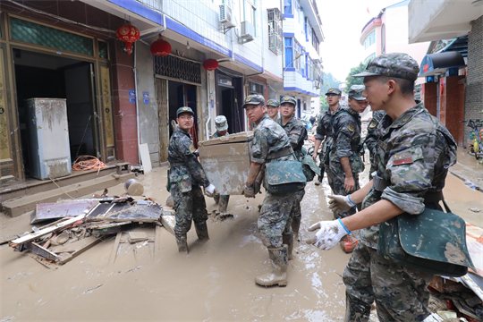 圖為武警第二機(jī)動(dòng)總隊(duì)某支隊(duì)救援官兵在搬運(yùn)受損物資。薛東東 攝