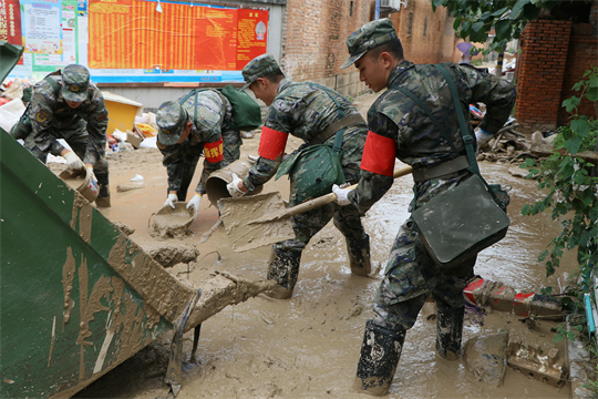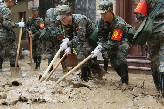 圖為武警第二機(jī)動(dòng)總隊(duì)某支隊(duì)救援官兵在一線清運(yùn)垃圾。薛東東 攝