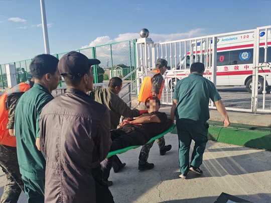 9月1日15時10分,丹東海警局接報警稱,遼丹漁25489號船一名船員在作業(yè)時因操作不慎右臂被機器卷入,造成粉碎性骨折,處于大量失血狀態(tài),但漁船靠港需4個多小時,急需海警救援。接警后,丹東海警局立即派遣附近海域巡邏的執(zhí)法快艇全速救助。15時50分許,受傷漁民被轉(zhuǎn)移至執(zhí)法快艇,執(zhí)法員一邊安撫傷員情緒,一邊聯(lián)系救援力量前往碼頭準(zhǔn)備接應(yīng)。16時30分,執(zhí)法快艇抵達(dá)附近港口后,受傷船員被送上救護(hù)車。從接警到成功將受傷漁民送至救護(hù)車,丹東海警局僅用時約1小時20分,為受傷漁民爭取了寶貴的救援時間。目前,該船員因救助及時,已無生命危險。