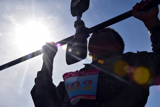 圖為參賽官兵在負(fù)重組合練習(xí)中沖擊冠軍。陳春越 攝