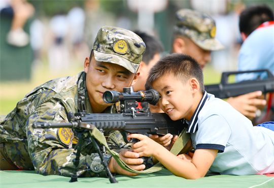 圖為在武警合肥支隊執(zhí)勤某大隊營區(qū),小學(xué)生在戰(zhàn)士的指導(dǎo)下體驗武器裝備。