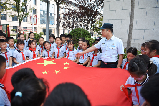 圖為在武警合肥支隊執(zhí)勤某大隊營區(qū),文職人員王帝在向小學(xué)生介紹國旗知識。