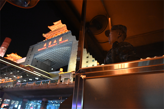 圖為夜晚執(zhí)勤哨兵精神振作警惕觀察著旅客出行情況。張鵬 攝