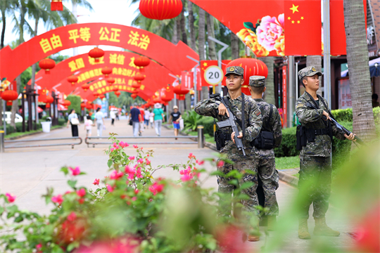 圖為擔負巡邏任務(wù)的武警海南總隊官兵在??谌f綠園臨時勤務(wù)點執(zhí)勤。