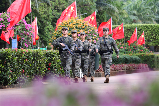 圖為擔負巡邏任務(wù)的武警海南總隊官兵在??诮鹋X公園巡邏執(zhí)勤。