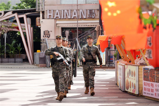 圖為擔負巡邏任務(wù)的武警海南總隊官兵在??谏习畎賲R城巡邏執(zhí)勤。