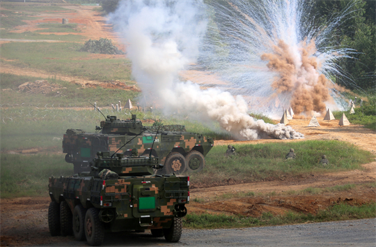圖為第74集團軍某旅“生死在一起連”在實兵戰(zhàn)術(shù)演練中,裝甲車快速通過通路。