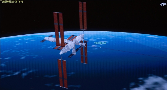 圖為10月26日在北京航天飛行控制中心拍攝的神舟十七號載人飛船和空間站天和核心艙前向端口對接過程的畫面。新華社記者 金立旺 攝