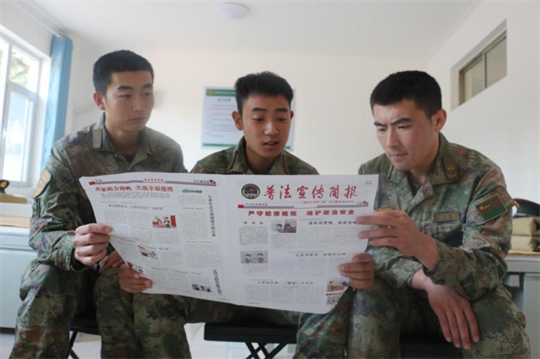 圖為基層官兵閱讀普法宣傳簡報(bào)。