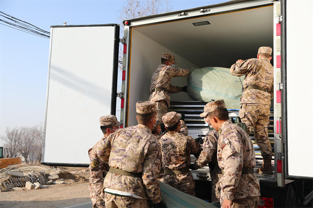 圖為武警青??傟犎蝿展俦徇\物資并裝車。