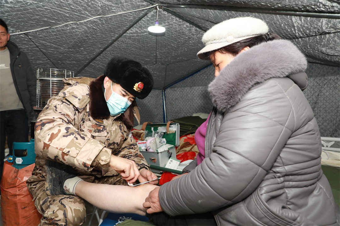 “您是哪里不舒服?”“一定要注意傷口保暖!”“快給大爺拿點布洛芬!”……12月19日,在青海省海東市民和縣中川鄉(xiāng)草灘村災(zāi)民安置點,武警青??傟犪t(yī)院的醫(yī)生們正緊張地為受災(zāi)群眾提供醫(yī)療義診服務(wù)。