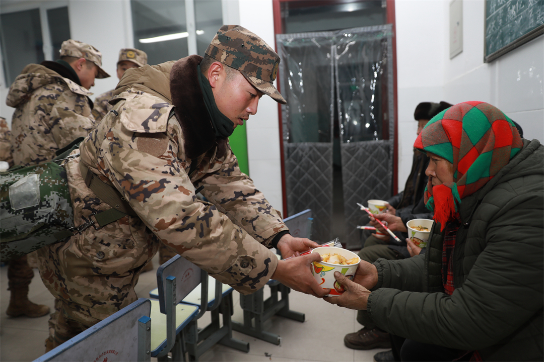 圖為武警青海總隊任務(wù)官兵為受災(zāi)群眾提供熱食。張先云 攝