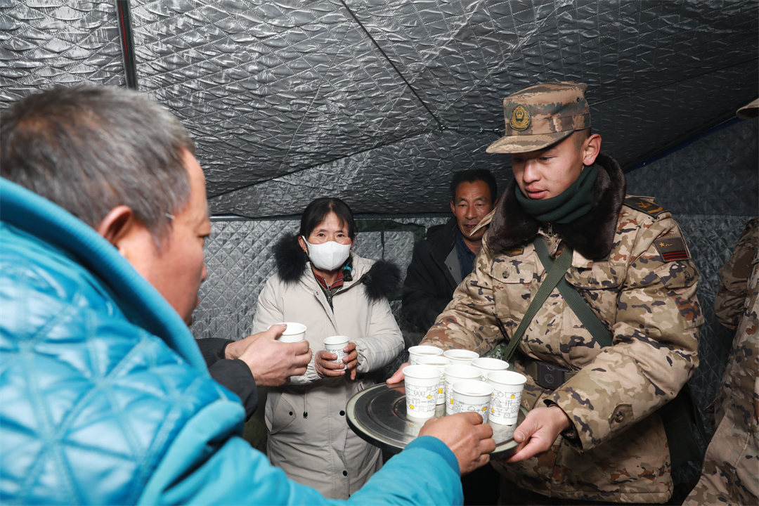 圖為武警青??傟犎蝿?wù)官兵為受災(zāi)群眾端上熱姜湯。曹展 攝