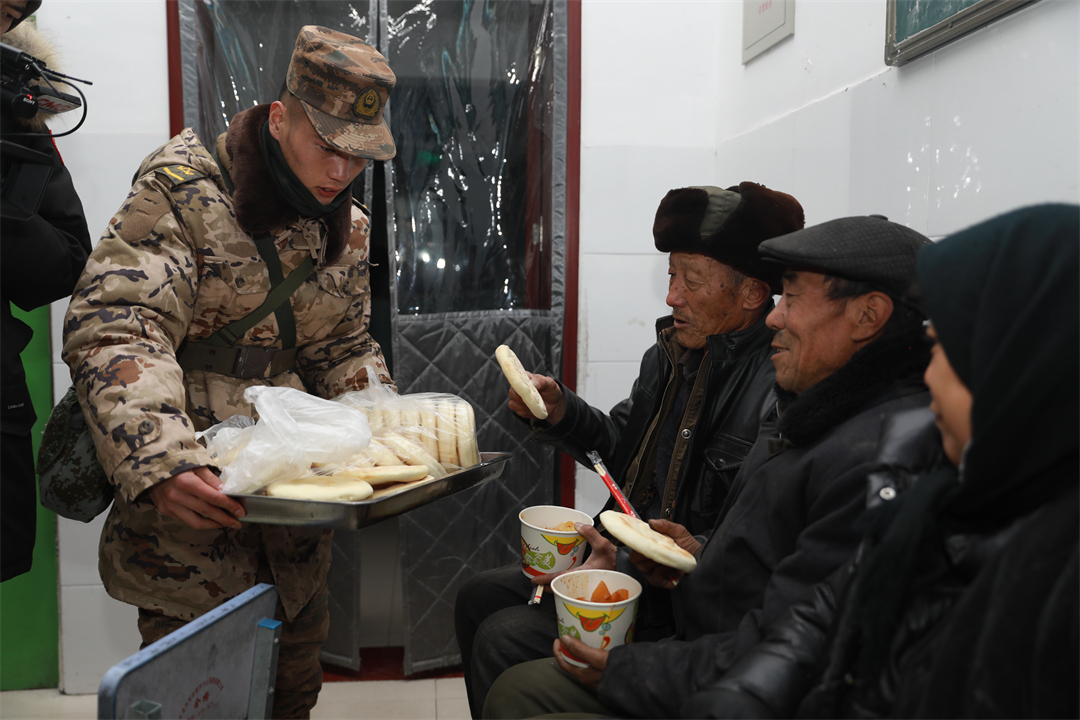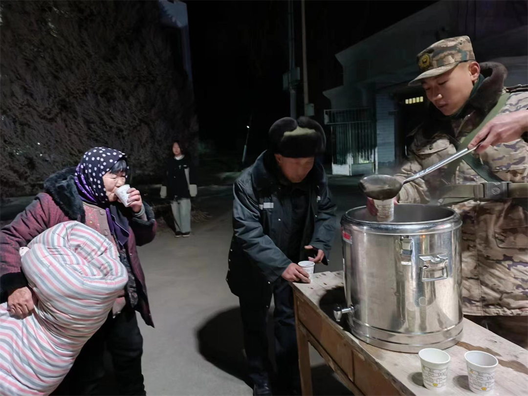 20余名炊事員搭鍋支灶,制作熱食。同時,他們還第一時間為群眾熬制熱姜湯,驅(qū)寒保暖。經(jīng)過兩個多小時忙碌,熱氣騰騰的羊肉粉湯做熟了,配上熱乎乎的餅子,200余名群眾吃上災(zāi)后第一頓熱乎飯。