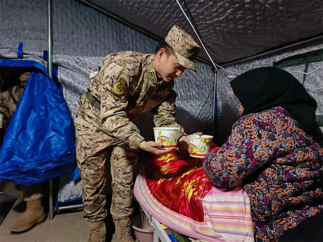 飯后已近晚上9點,群眾陸續(xù)回到自己的帳篷,室外氣溫降至零下七八攝氏度。官兵們不言苦、不怕累,收拾妥當(dāng)后,又分組對安置點進行安全檢查、為有需要的群眾送去毛毯、統(tǒng)計物資藥品、準備第二天早飯……