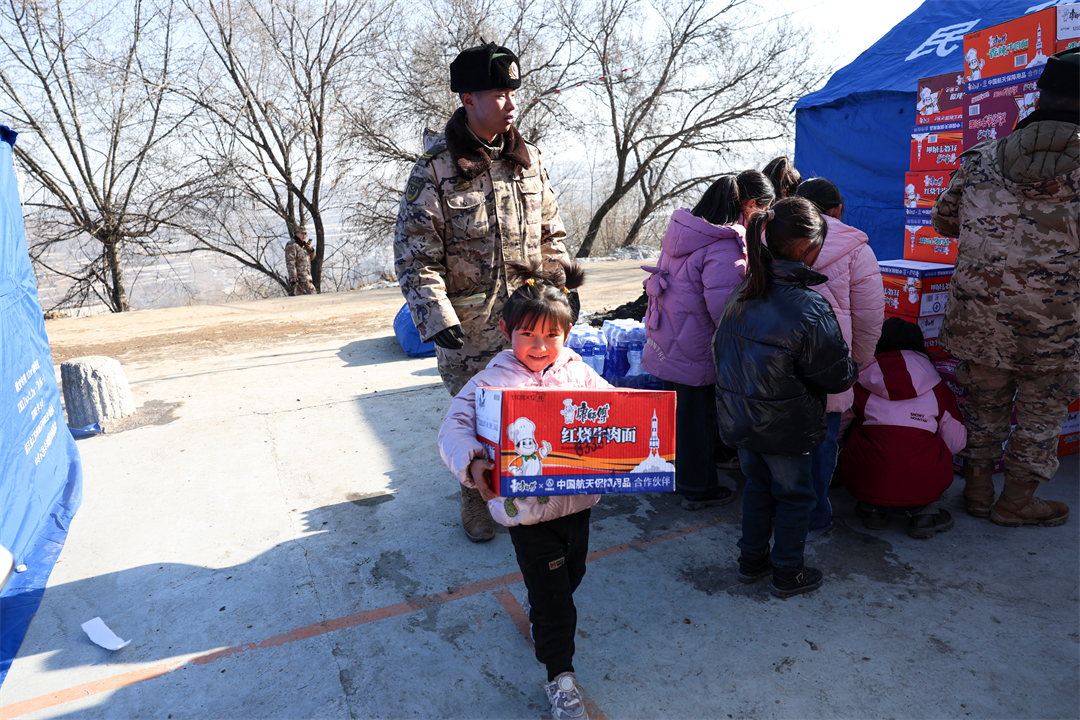 圖為12月21日,在甘肅省臨夏州積石山縣劉集鄉(xiāng)陽屲村安置點(diǎn),一名小朋友和武警甘肅總隊臨夏支隊官兵一起搬運(yùn)救災(zāi)物資。