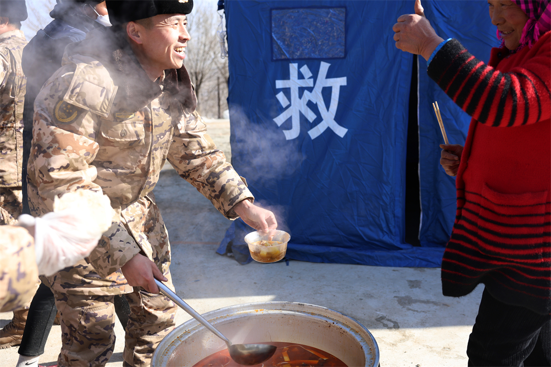 12月21日中午,武警甘肅總隊臨夏支隊官兵在積石山縣劉集鄉(xiāng)陽屲村受災(zāi)群眾安置點(diǎn)搭帳篷、送物資,利用野戰(zhàn)給養(yǎng)單元為群眾制作熱食。群眾說:“人民軍隊愛人民,謝謝你們的關(guān)心!”