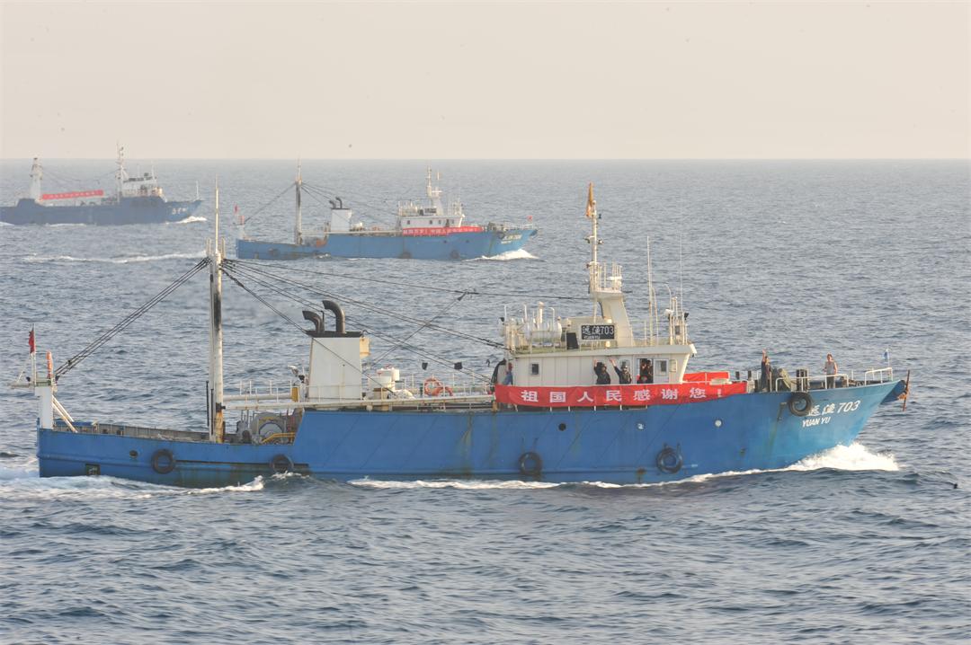 圖為今年10月22日,第45批護(hù)航編隊烏魯木齊艦、東平湖艦為10艘中國漁船進(jìn)行護(hù)航。王遠(yuǎn)方 攝