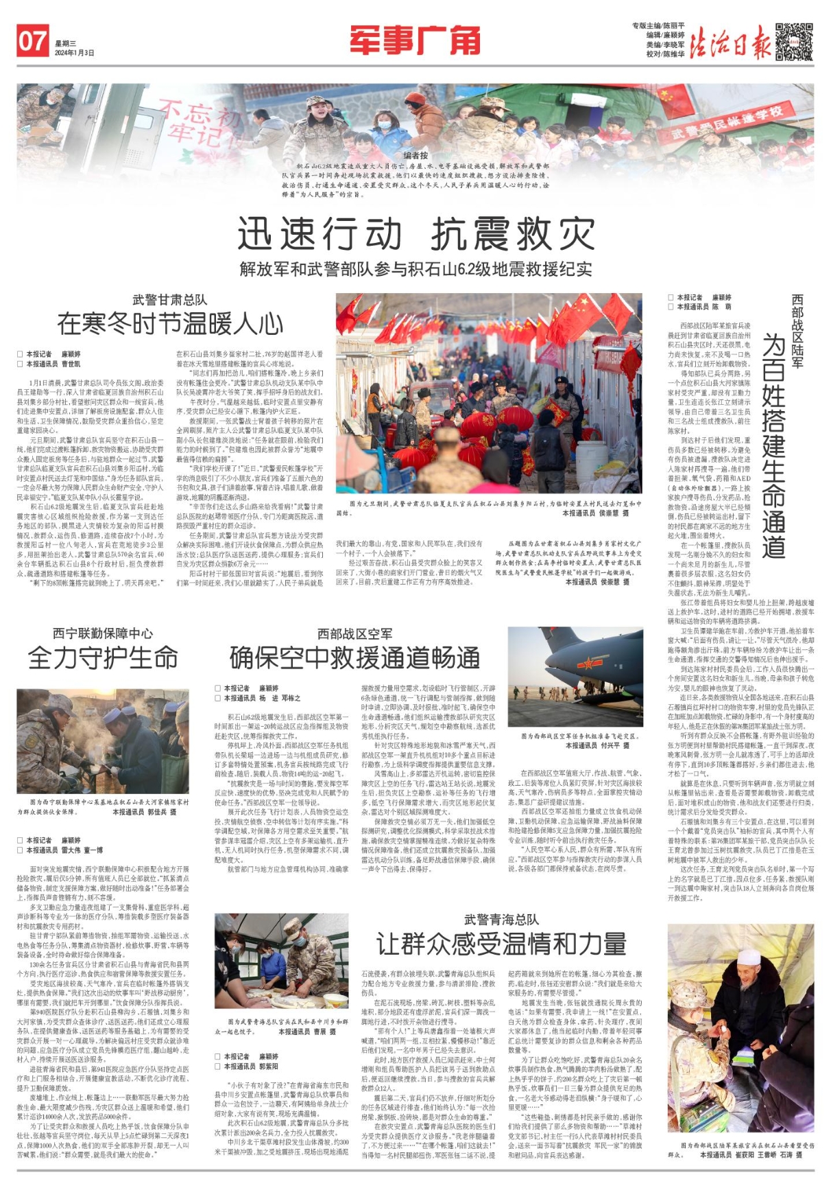 壓題圖為在甘肅省積石山縣劉集鄉(xiāng)肖家村文化廣場,武警甘肅總隊機動支隊官兵在野戰(zhàn)炊事車上為受災(zāi)群眾制作熱食;在高李村臨時安置點,武警甘肅總隊醫(yī)院醫(yī)生與“武警愛民帳篷學(xué)校”的孩子們一起做游戲。侯崇慧 攝