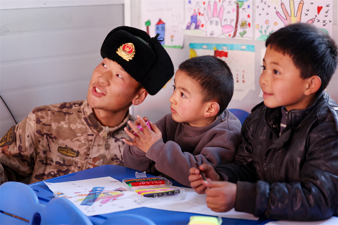 圖為武警甘肅總隊臨夏支隊官兵在甘肅省積石山縣劉集小學(xué)臨時教學(xué)點,帶著孩子做手工喜迎新年。侯崇慧 攝