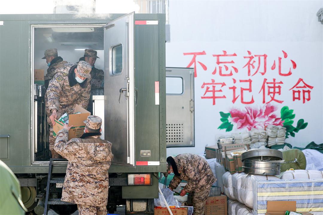 受災(zāi)地區(qū)海拔較高、天氣寒冷,官兵在臨時帳篷外搭鍋支灶,提供熱食保障。“我們這次出動的炊事車叫‘野戰(zhàn)移動廚房’,哪里有需要,我們就把車開到哪里。”飲食保障分隊指揮員說。