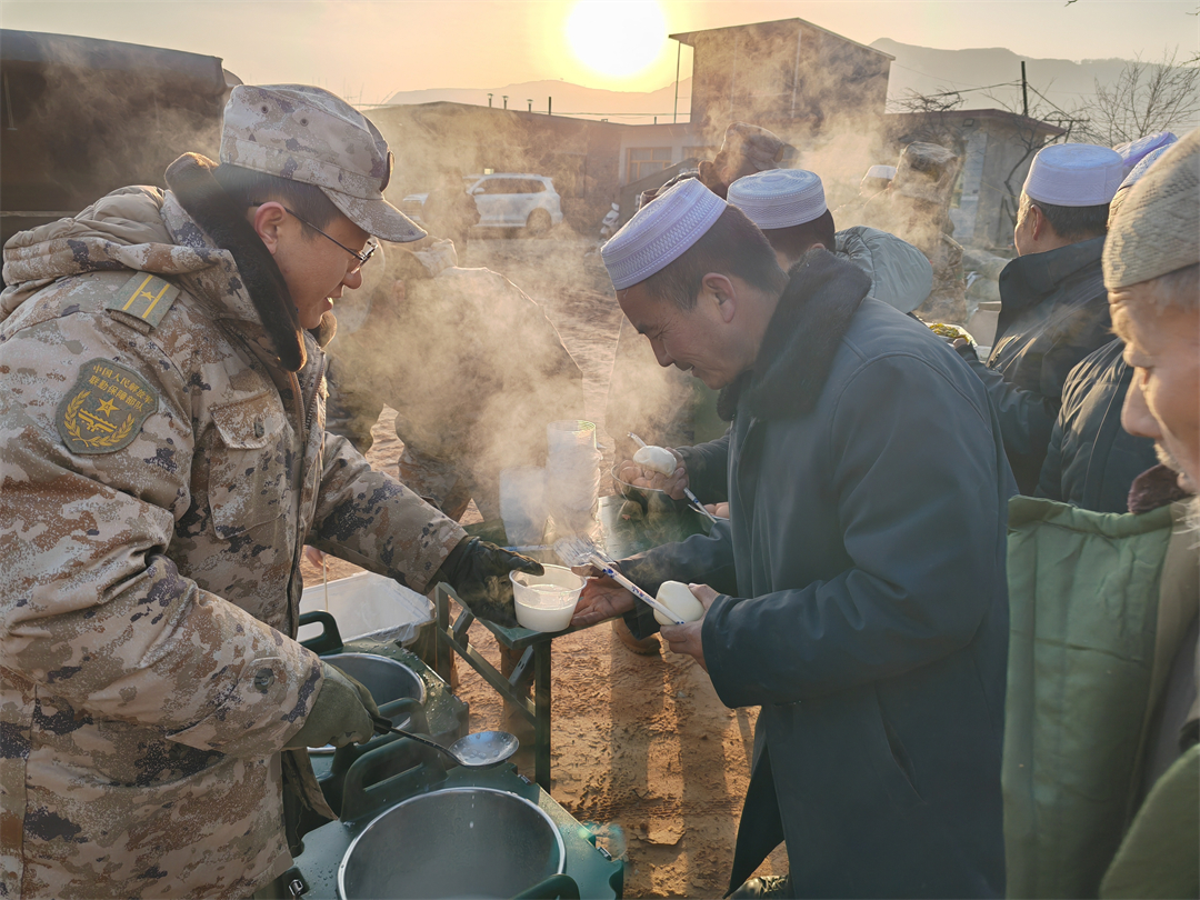 圖為西寧聯(lián)勤保障中心某基地在積石山縣大河家鎮(zhèn)陳家村為群眾提供伙食保障。郭佳兵 攝