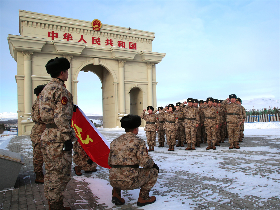在祖國北疆的國門前,全體人員面向黨旗莊嚴(yán)宣誓。大家緊握的拳頭堅(jiān)定有力,鏗鏘的誓言響徹云霄,表達(dá)著對黨忠誠的堅(jiān)定信仰和為國防事業(yè)不懈奮斗的決心。