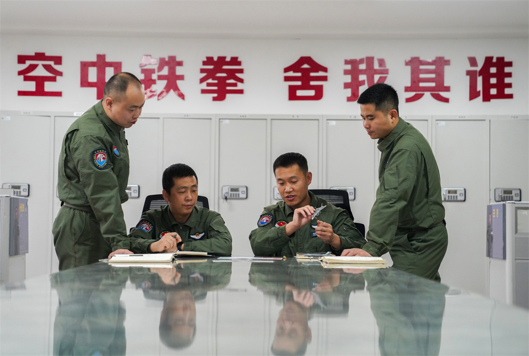 圖為空軍“王海大隊”飛行員進(jìn)行空戰(zhàn)戰(zhàn)術(shù)復(fù)盤研究。師勇進(jìn) 攝