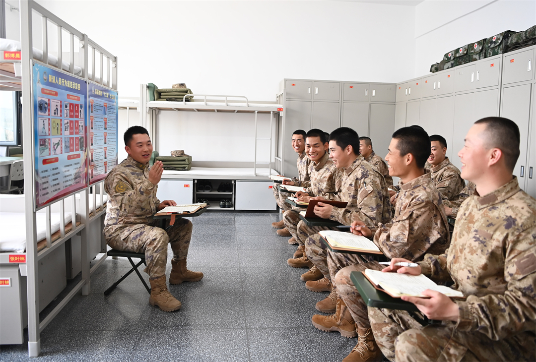 圖為3月28日,陸軍某綜合訓(xùn)練基地參加集訓(xùn)的新兵第一次召開班務(wù)會,班長與大家集體談心。