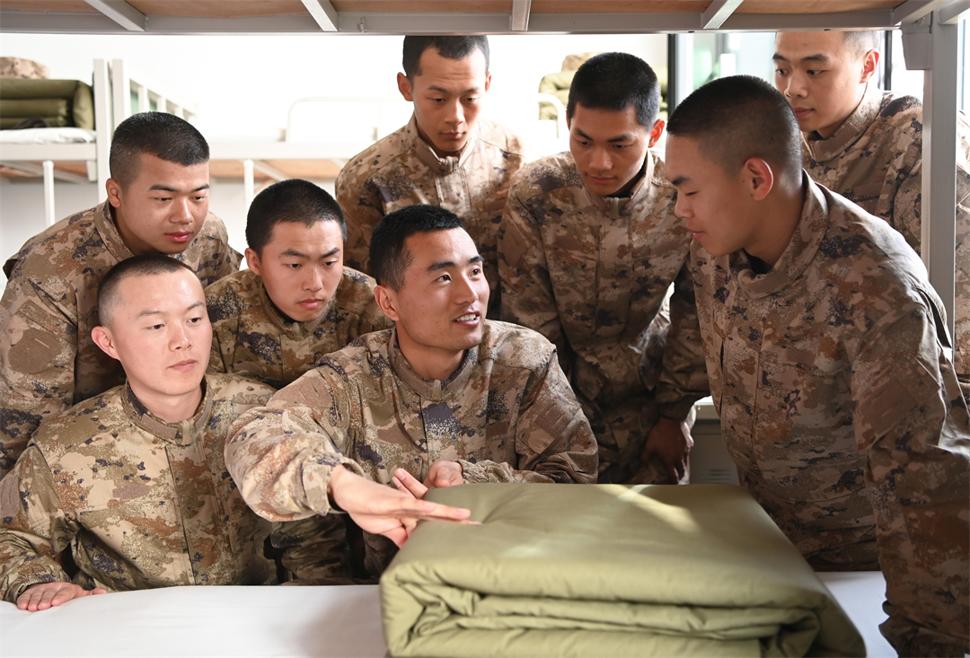 圖為3月28日,陸軍某綜合訓(xùn)練基地二次入伍的大學(xué)生新戰(zhàn)士郭威(中)為戰(zhàn)友們傳授如何整理內(nèi)務(wù)。