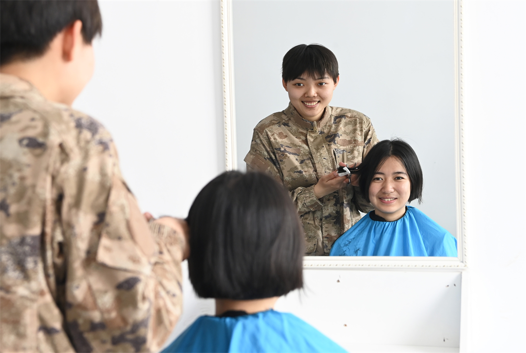 圖為3月28日,陸軍某綜合訓(xùn)練基地參加新訓(xùn)的女兵入營后整理軍容風(fēng)紀(jì),剪掉長頭發(fā)。